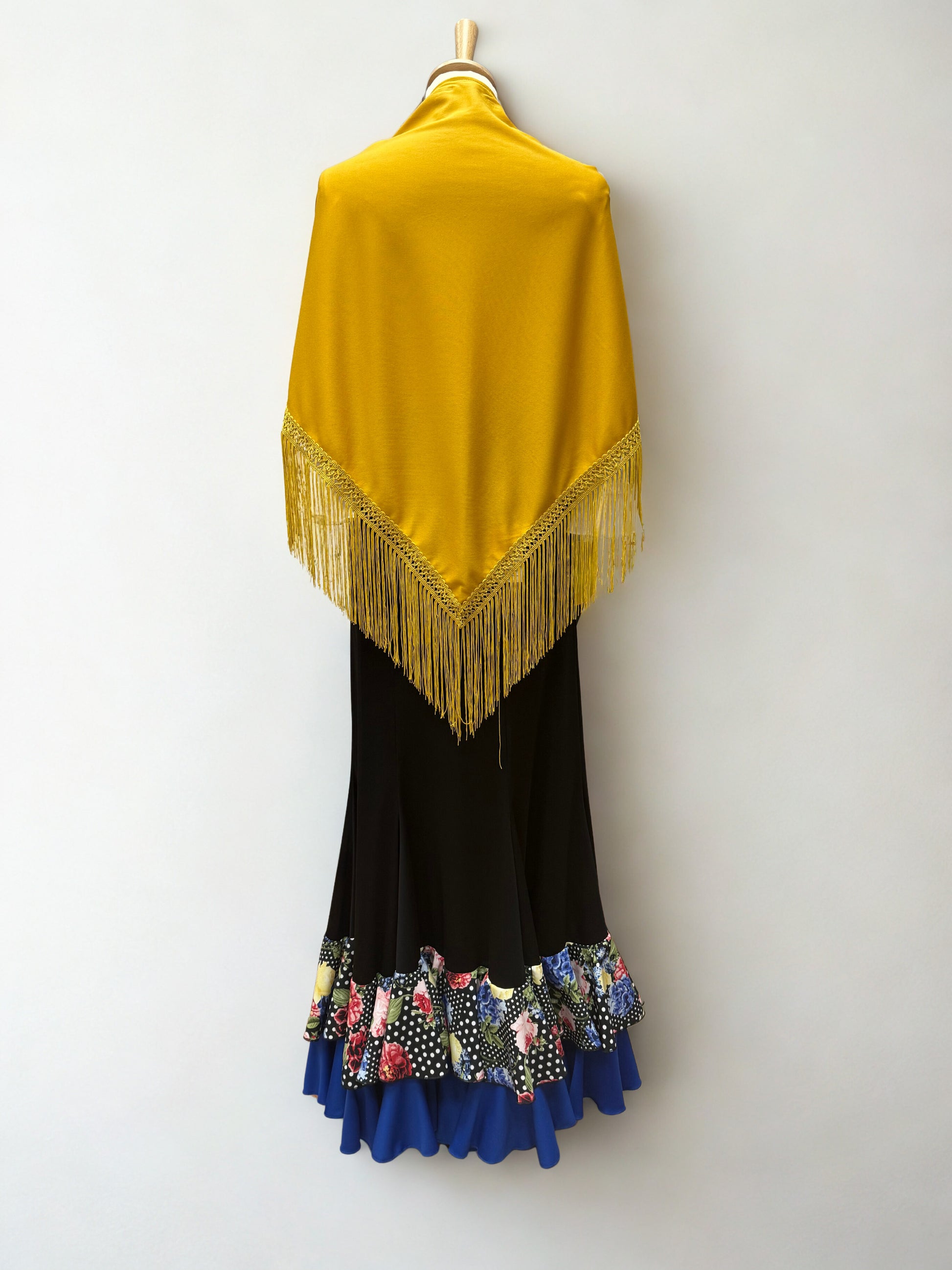 MANTÓN MOSTAZA EN PICO LISO CON FLECOS